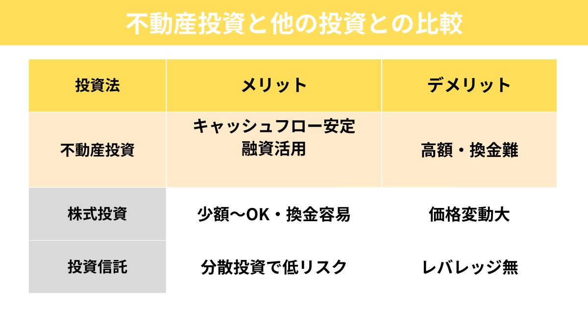不動産投資は大きな資金が必要で流動性が低いものの、安定したキャッシュフローと融資活用によるレバレッジが魅力です。
