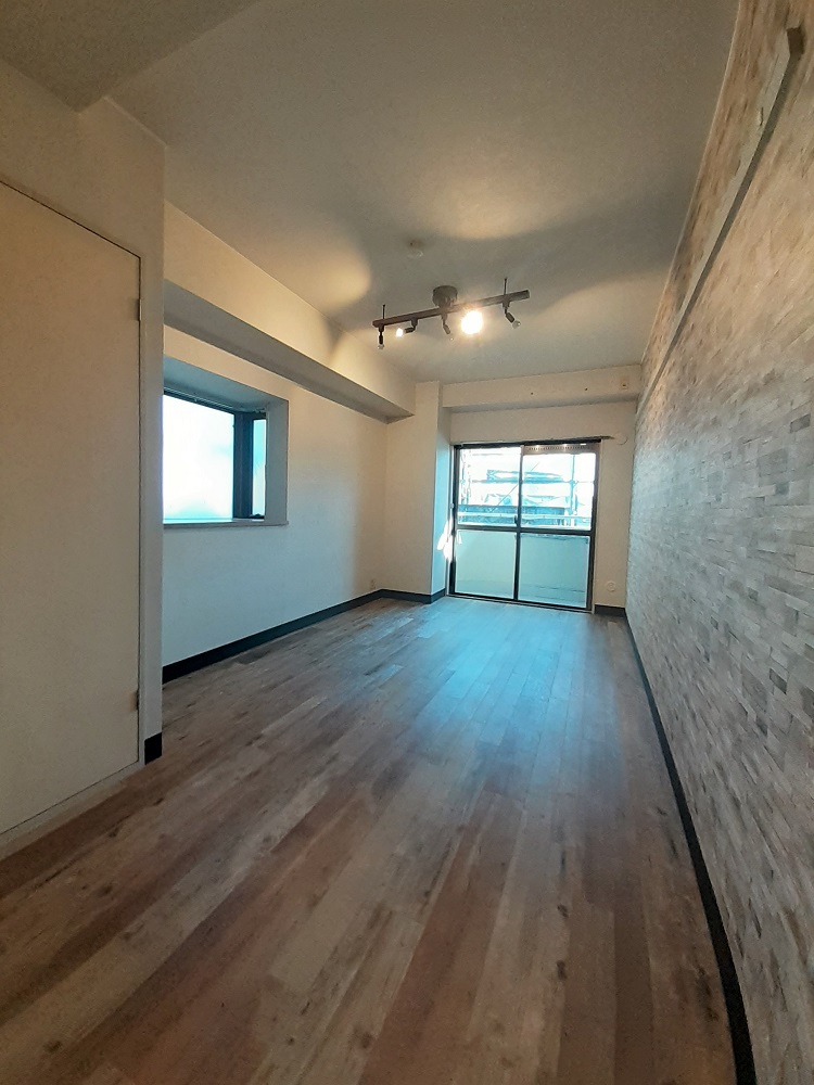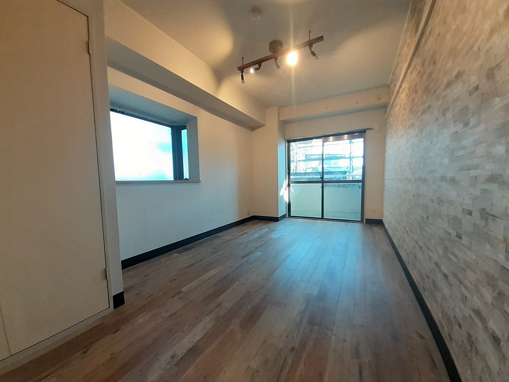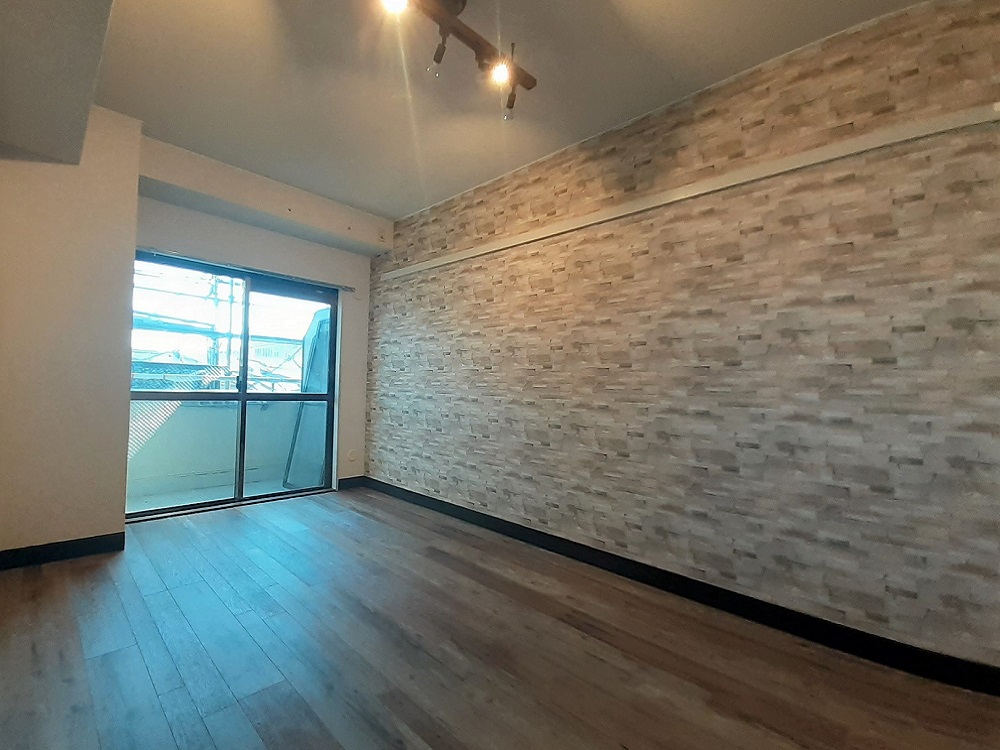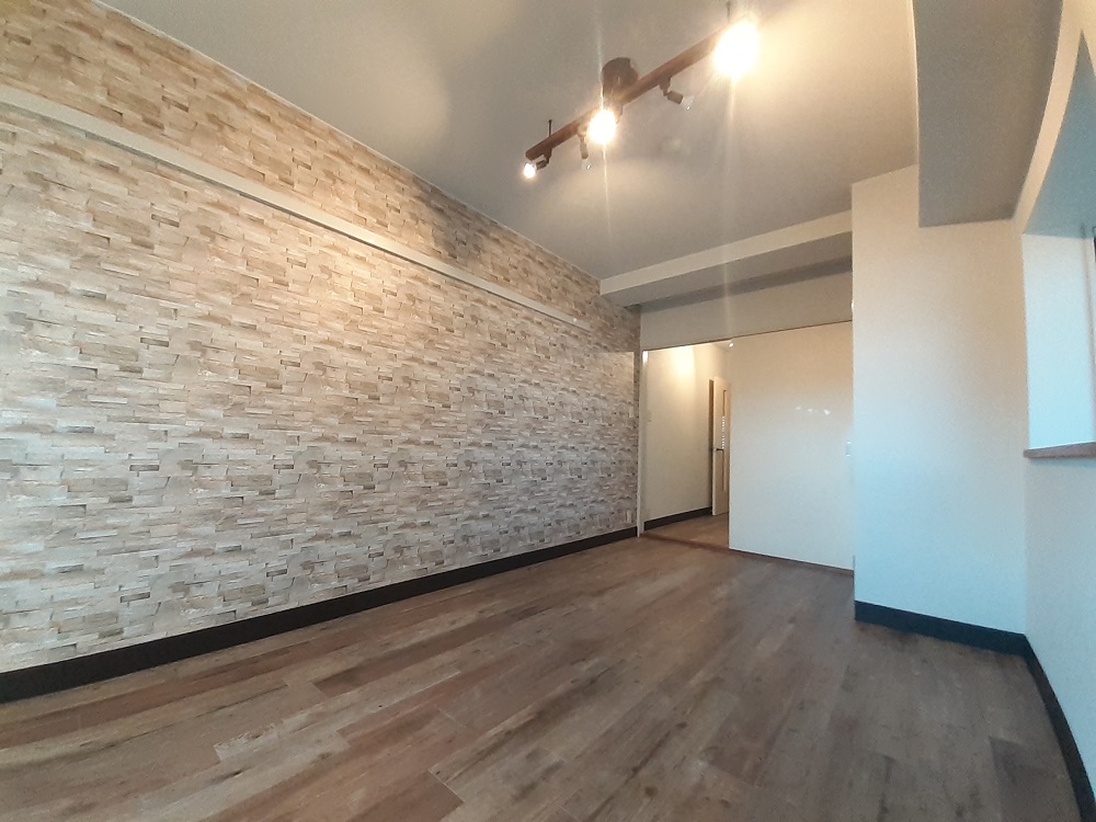 駅前分譲マンション1DKのバリューアップリフォーム。アンティークウッドの床にレンガ調のアクセントクロスでオシャレなブルックリンスタイルを演出。